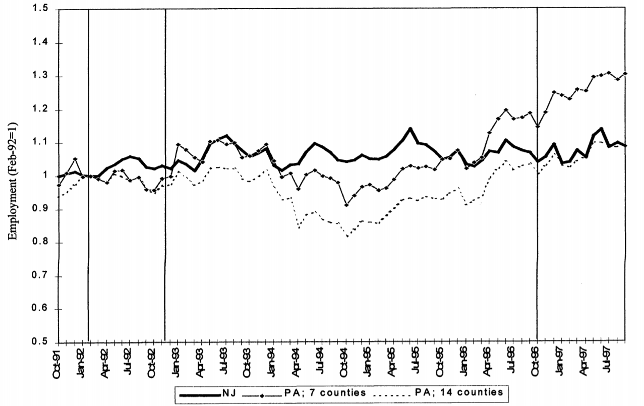 노동경제학자 데이비드 카드(David Card)와 앨런 크루거(Alan Krueger)의 1994년 대표 논문 (링크)