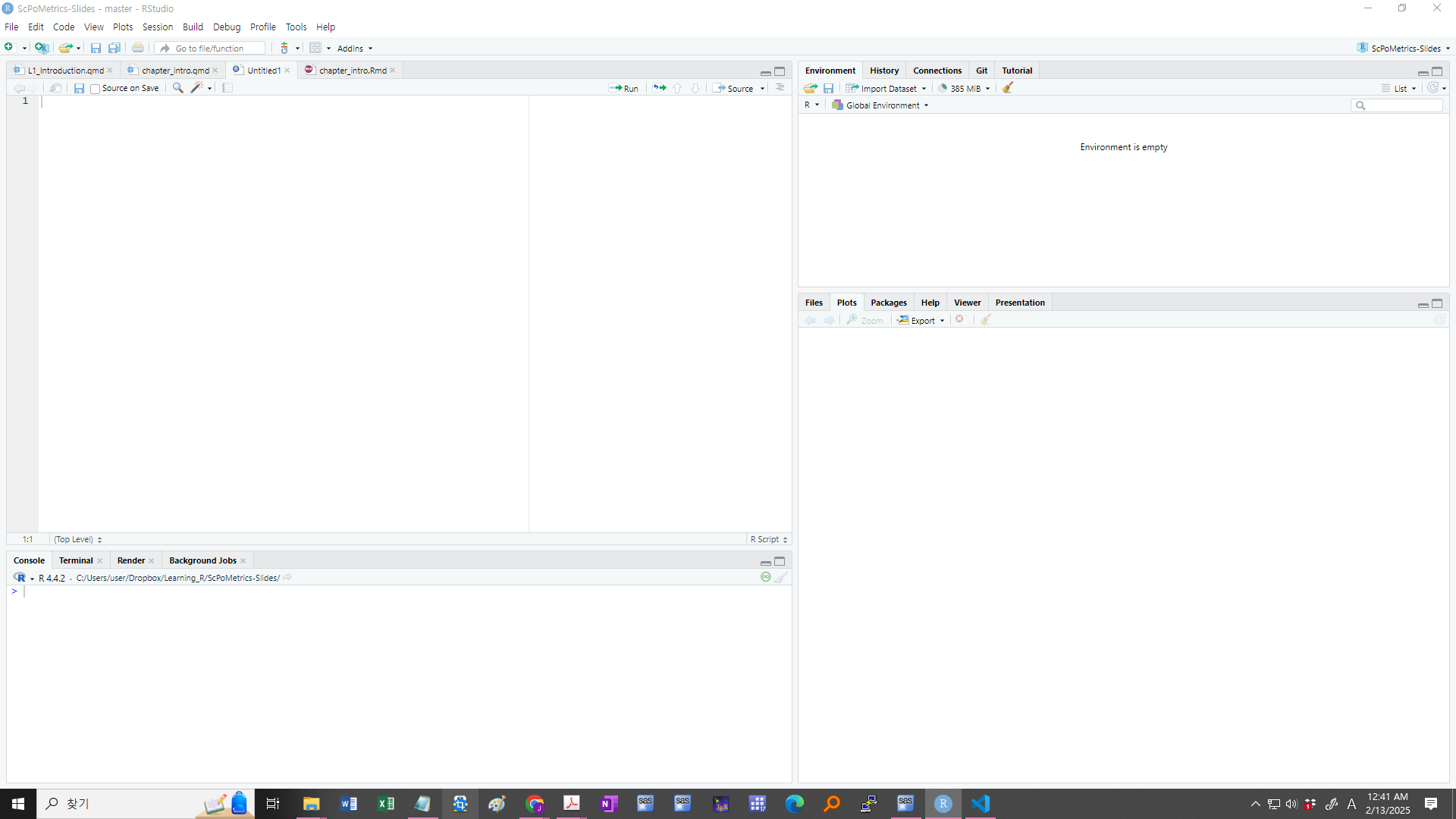 설치가 정상적으로 완료되었는지 확인하기 위해 R과 RStudio 실행.