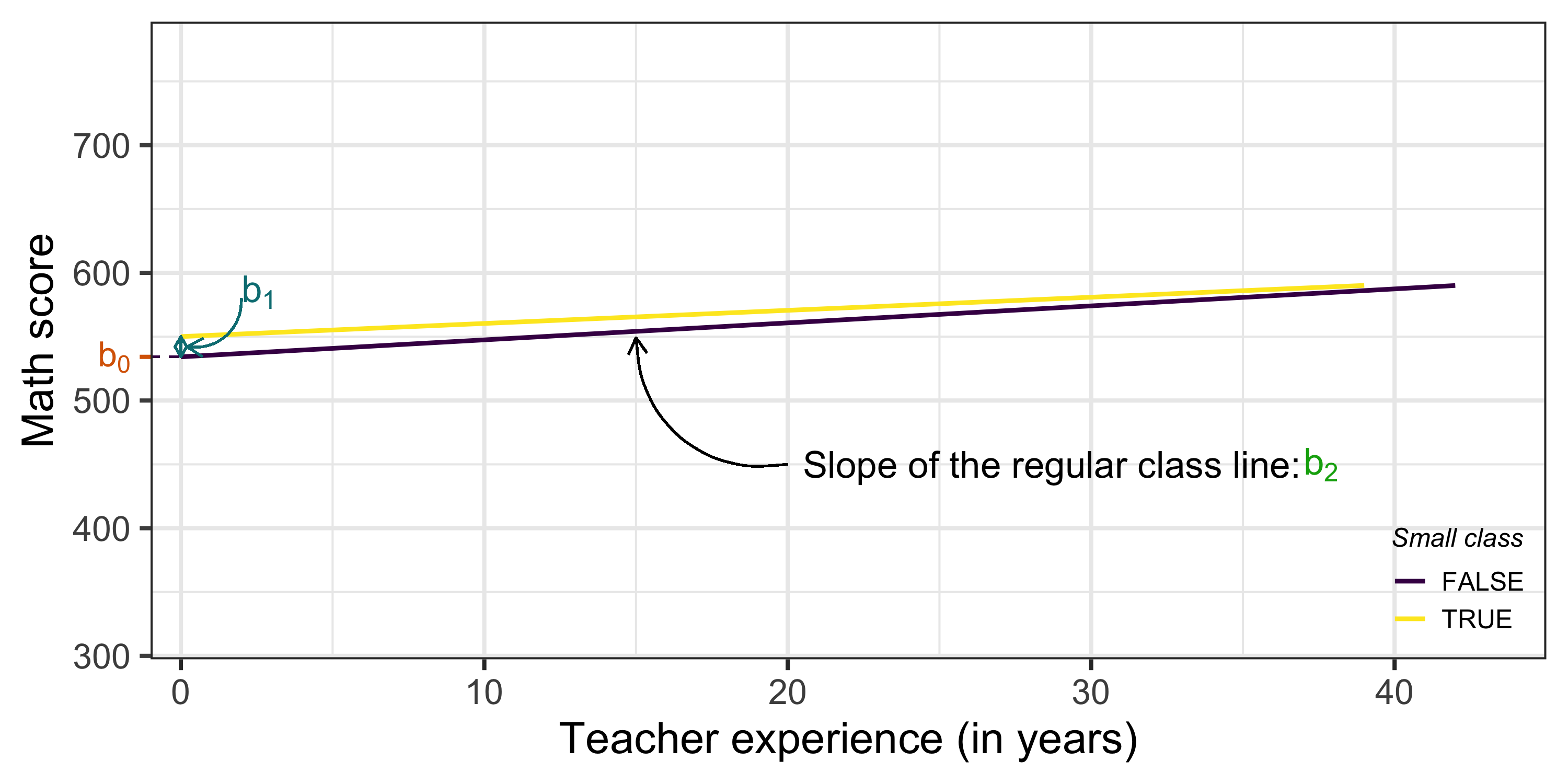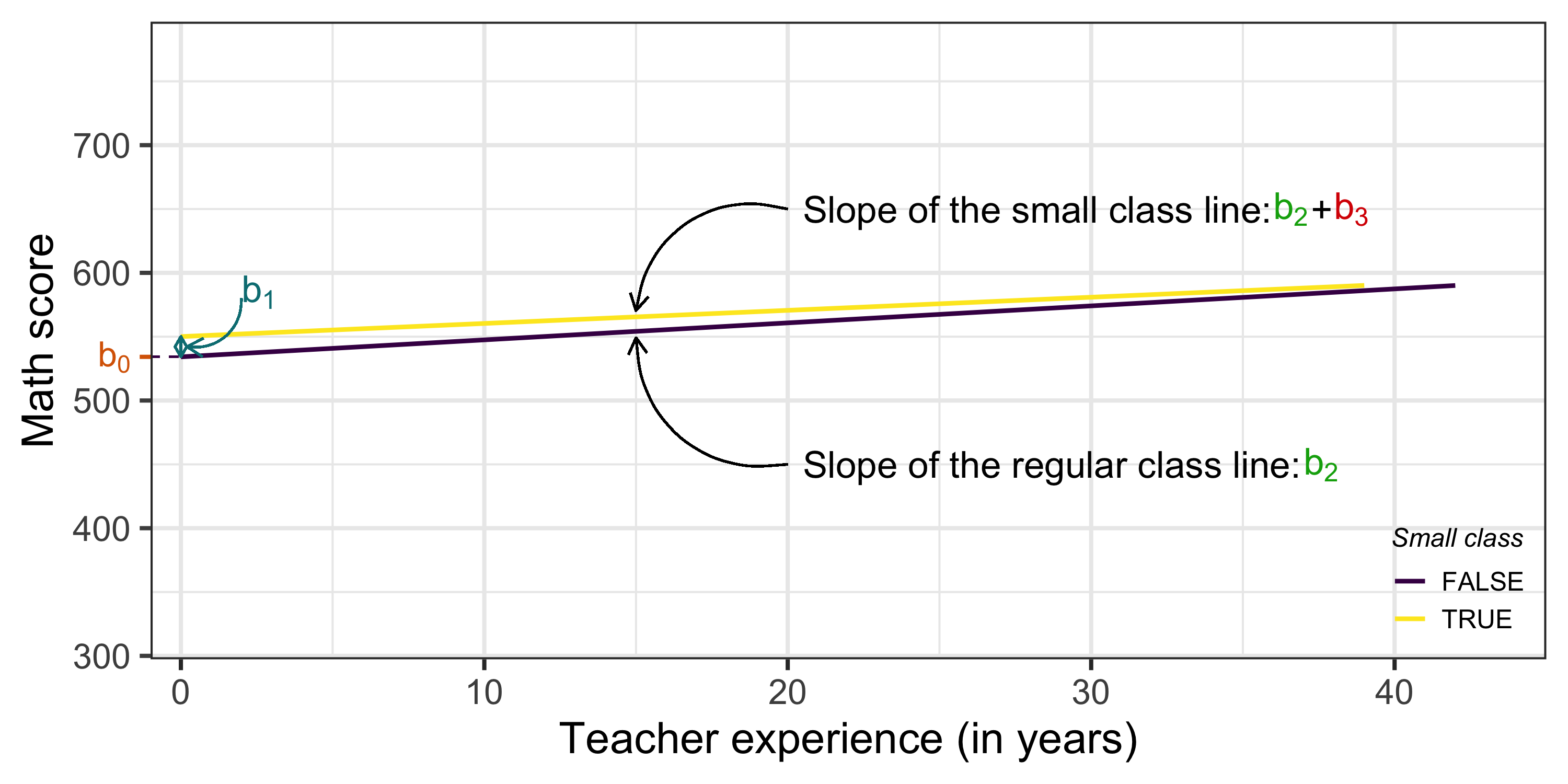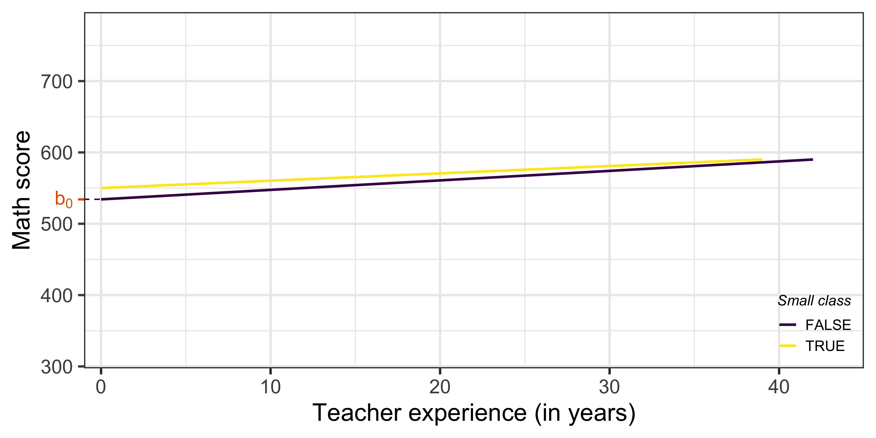 \[ \mathbb{E}[\textrm{score}_i | \textrm{small}_i = 0 \textrm{ & experience}_i = 10] = \color{#d96502}{b_0} + \color{#02AB0D}{b_2}*10 \]