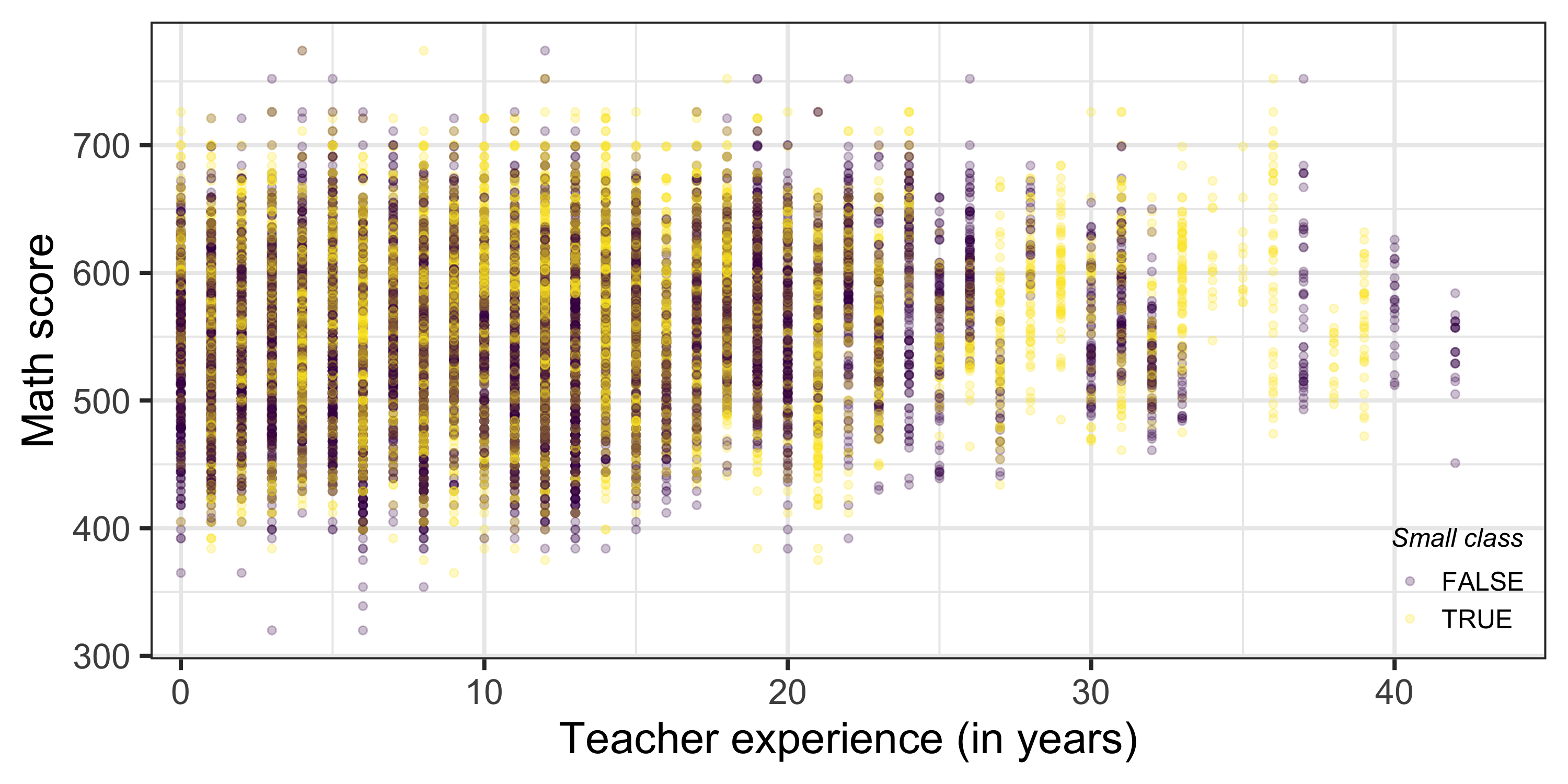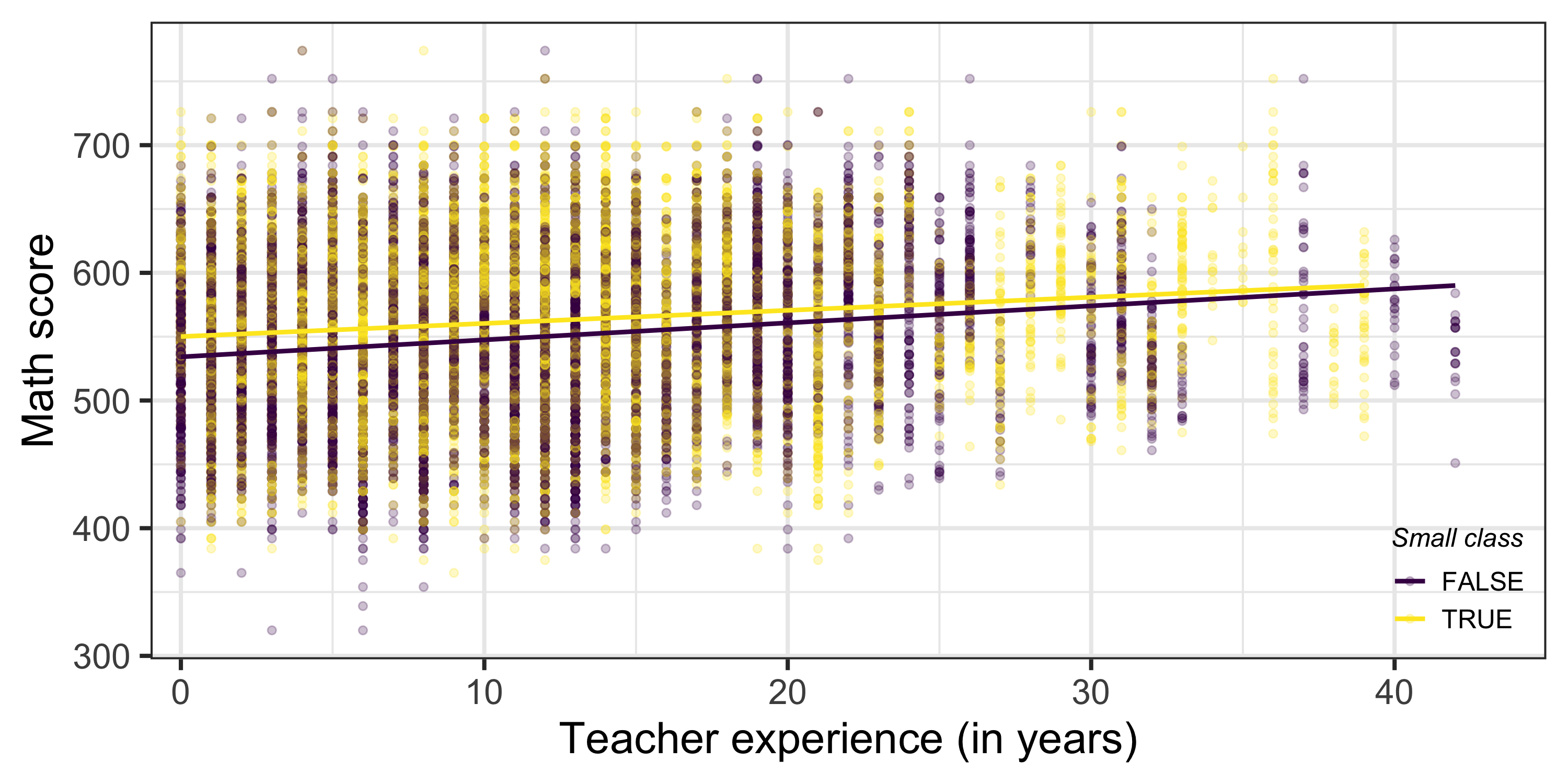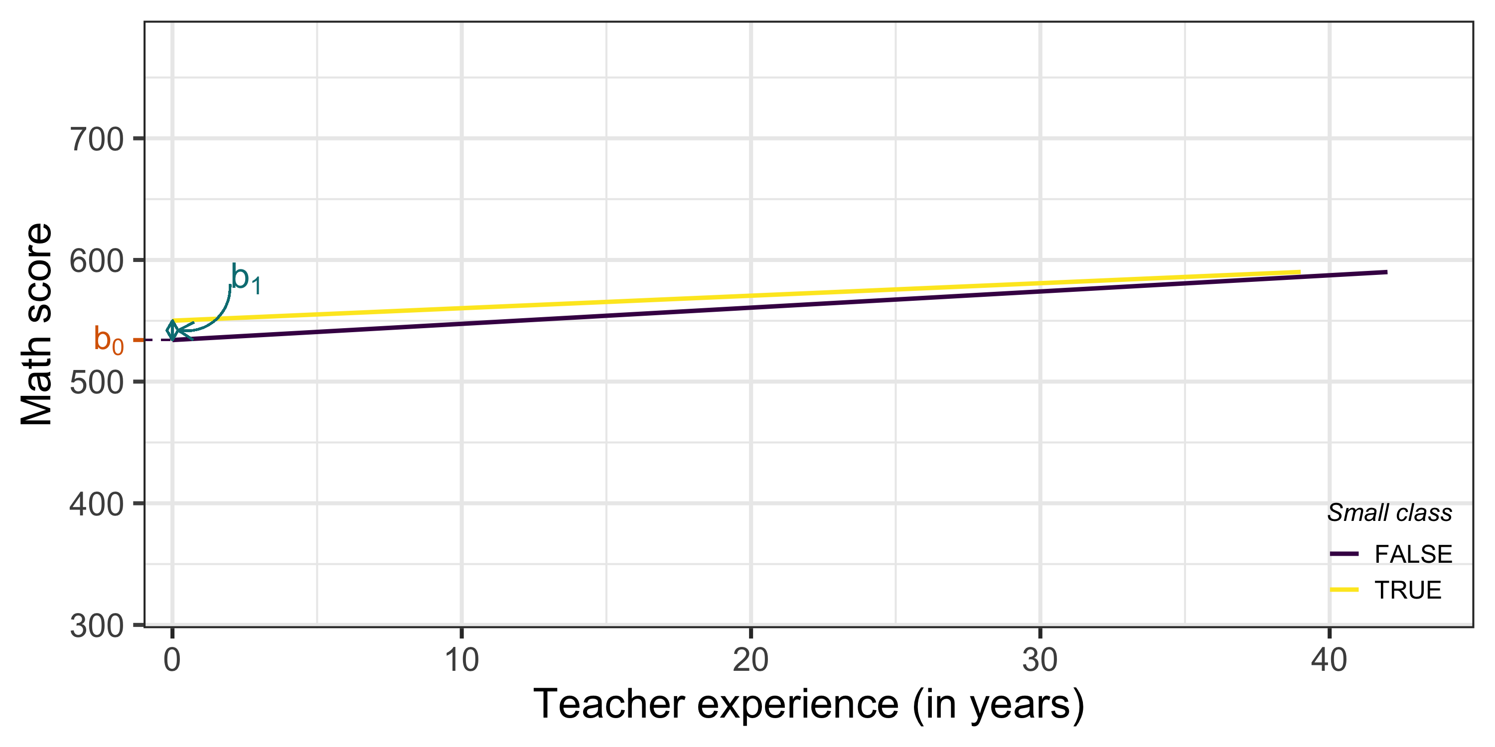 \[ \mathbb{E}[\textrm{score}_i | \textrm{small}_i = 0 \textrm{ & experience}_i = 10] = \color{#d96502}{b_0} + \color{#02AB0D}{b_2}*10 \]