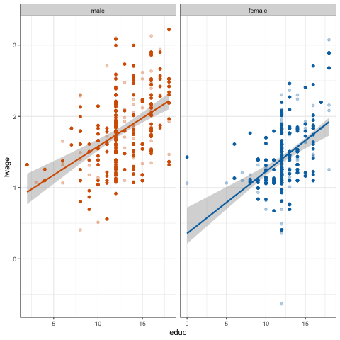 ggplot(data=cps,aes(y = log_wage, x = education, colour = gender)) +