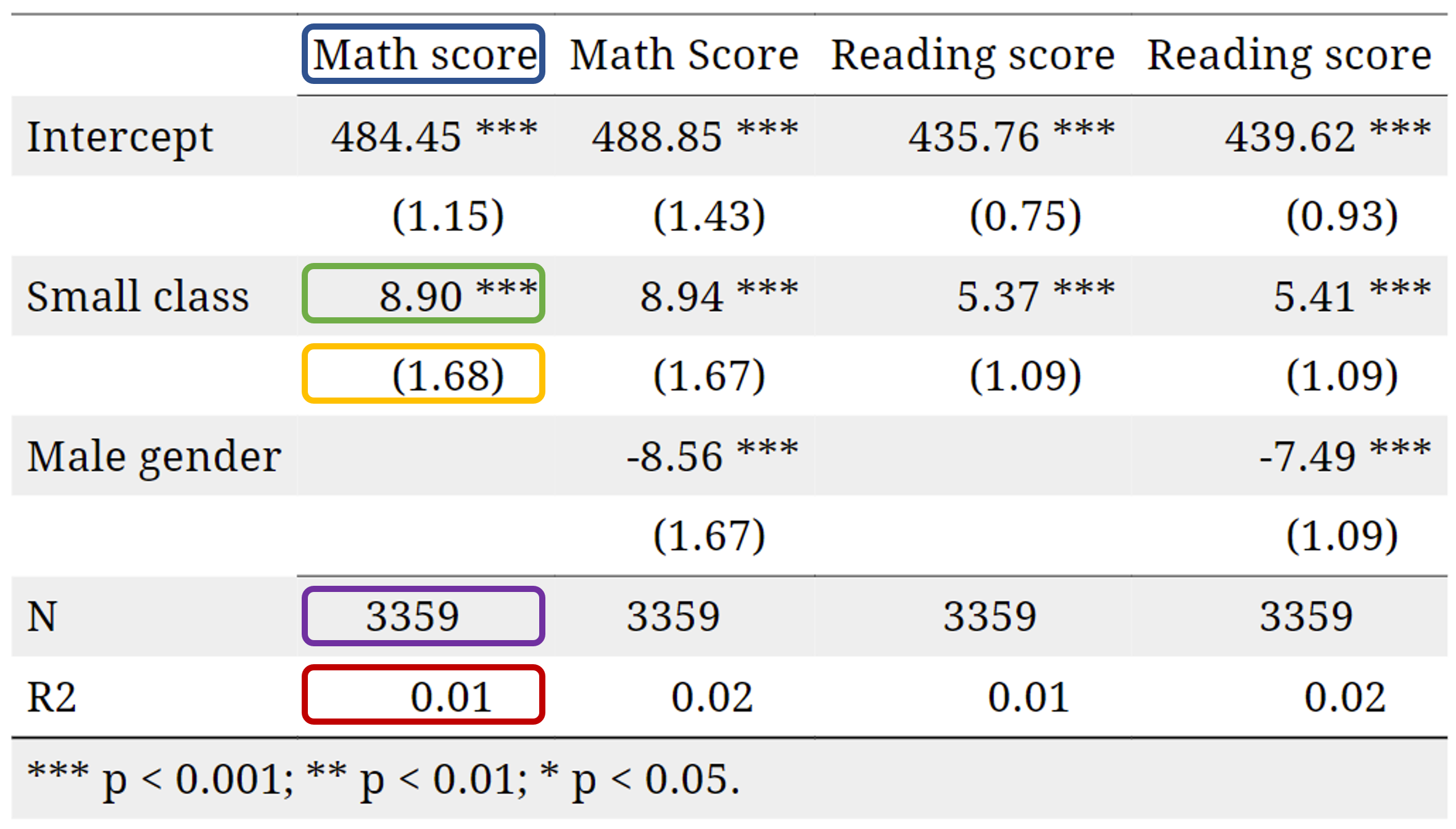 "Male gender" = "gendermale"))| Math score | Math Score | Reading score | Reading score | |